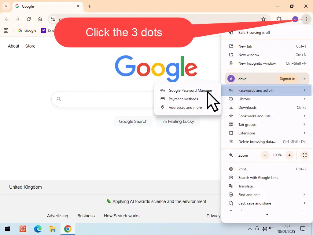 To see the passwords saved in Google Password Manager, open Chrome and then click the 3 vertical dots in the top right hand corner of the window. On the menu that opens, hover your mouse over Passwords & Autofill, then click Google Password Manager.