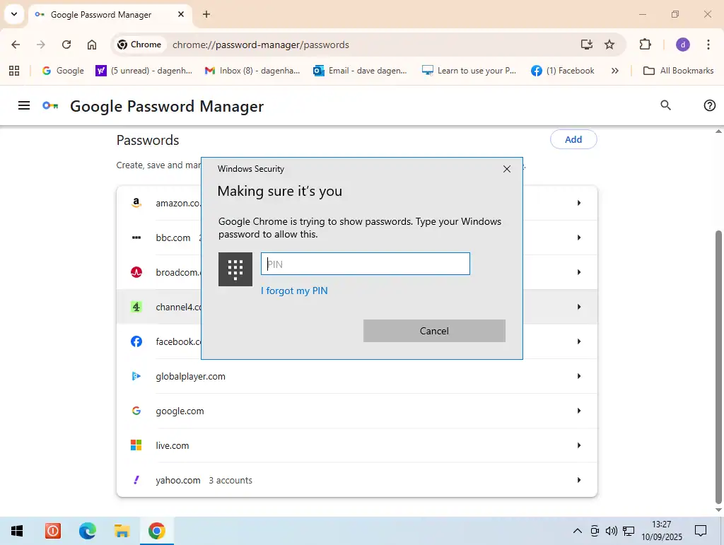 When you’re trying to see your saved passwords in Chrome, you may be asked to enter a password or a PIN. Type in the password or PIN that you use to log on to your Windows computer.