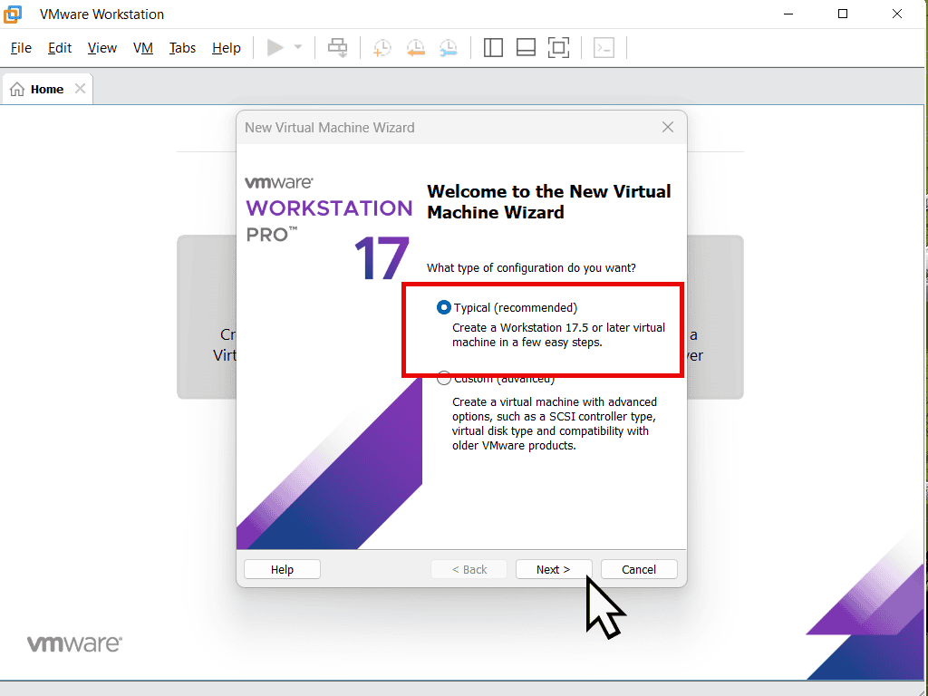 The New Virtual Machine Wizard will open. Select Typical (recommended) and then click the Next button.